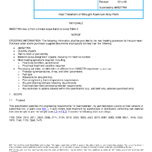 This specification specifies the engineering requirements for heat treatment, by part fabricators (users) or their vendors or subcontractors, of parts (see 8.8.1). It also covers heat treatment by warehouses or distributors converting raw material from one temper to another temper (see 1.3 and 8.5). It covers the following aluminum alloys: