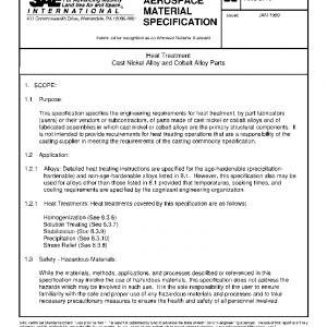 This specification specifies the engineering requirements for heat treatment, by part fabricators (users) or their vendors or subcontractors, of parts made of cast nickel or cobalt alloys and of fabricated assemblies in which cast nickel or cobalt alloys are the primary structural components. It is not intended to provide requirements for heat treating operations that are a responsibility of the casting supplier in meeting the requirements of the casting commodity specification.