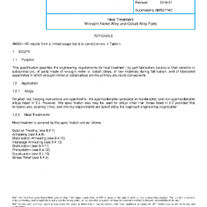 This specification specifies the engineering requirements for heat treatment, by part fabricators (users) or their vendors or subcontractors, of parts made of wrought nickel or cobalt alloys, of raw materials during fabrication, and of fabricated assemblies in which wrought nickel or cobalt alloys are the primary structural components.