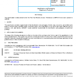 This specification provides requirements for the identification and packaging of sheet, strip, extrusions, and molded parts made of natural rubber, synthetic rubber, reclaimed rubber, and combinations of the above with other materials such as asbestos, cork, and fabrics. AMS2817 covers preferred requirements for identification and packaging of preformed packings.
