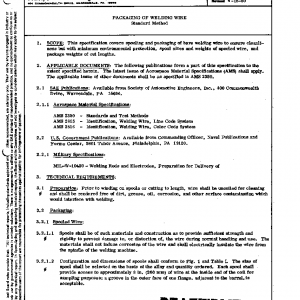 This specification covers spooling and packaging of bare welding wire to ensure cleanliness but with minimum environmental protection, spool sizes and weights of spooled wire, and package weights of cut lengths.