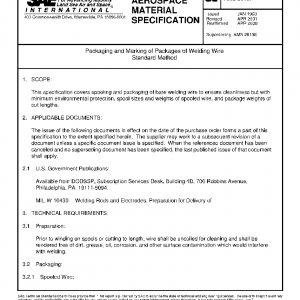 This specification covers spooling and packaging of bare welding wire to ensure cleanliness but with minimum environmental protection, spool sizes and weights of spooled wire, and package weights of cut lengths.