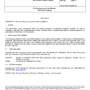 This specification covers procedures which will provide protection of preformed packings, primarily “O” rings of elastomeric materials, from contamination by foreign materials prior to installation and ensure positive identification by part number of each piece until it is installed.
