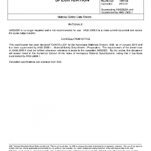 This specification has been declared “CANCELLED” by the Aerospace Materials Division, SAE, as of xxxx and has been superseded by ANSI Z400.1, Material Safety Data Sheets -Preparation. The requirements of the latest issue of ANSI Z400.1 shall be fulfilled whenever reference is made to the cancelled AMS2825. By this action, this document will remain listed in the Numerical Section of the Index of Aerospace Material Specifications, noting that it has been superseded by ANSI Z400.1.