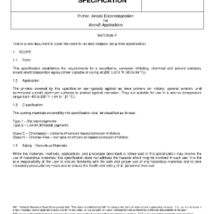 This specification establishes the requirements for a waterborne, corrosion inhibiting, chemical and solvent resistant, anodic electrodeposition epoxy primer capable of curing at 200 to 210 °F (93 to 99 °C).