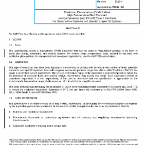 This specification covers a fluorocarbon (FKM) elastomer that can be used to manufacture product in the form of sheet, strip, tubing, extrusions, and molded shapes. For molded rings, compression seals, molded O-ring cord, and molded-in-place gaskets for aeronautical and aerospace applications, use the AMS7259 specification.
