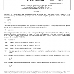 This specification covers three types and three classes of fuel-resistant polysulfide (T) sealing compound with low specific gravity, supplied as a two-component system which cures at room temperature.