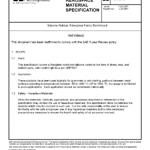 This specification covers a fiberglass reinforced silicone rubber in the form of sheet, strip, and molded parts, color coded light blue per ARP1527.