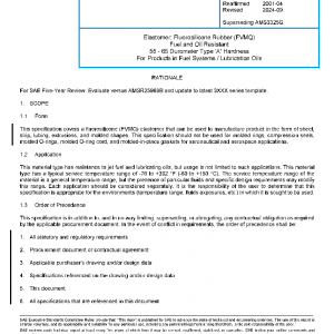 This specification covers a fluorosilicone (FVMQ) elastomer that can be used to manufacture product in the form of sheet, strip, tubing, extrusions, and molded shapes. This specification should not be used for molded rings, compression seals, molded O-rings, molded O-ring cord, and molded-in-place gaskets for aeronautical and aerospace applications.