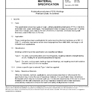 This specification covers two types of virgin, unfilled polytetrafluoroethylene (PTFE) in the form of molded rods, tubes, and shapes. This specification does not apply to product over 12 inches (305 mm) in length, rods under 0.750 inch (19.05 mm) in diameter, and tubes having wall thickness under 0.500 inch (12.70 mm).