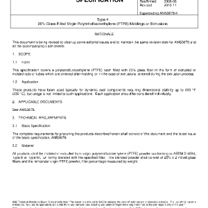 This specification covers a polytetrafluoroethylene (PTFE) resin filled with 25% glass fiber in the form of extruded or molded rods or tubes which are sintered after molding or, in the case of extrusions, sintered during the extrusion process.