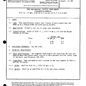 This specification covers four classes of para-aramid tape and webbing of a single width and with varying weights.