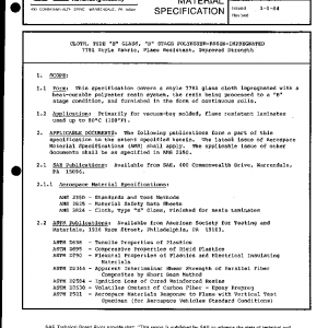 This specification covers a style 7781 glass cloth impregnated with a heat-curable polyester resin system, the resin being processed to a “B” stage condition, and furnished in the form of continuous rolls.