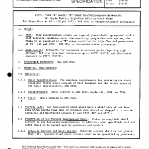 This specification covers one type of glass cloth impregnated with a heat-reactive, addition-cure, thermosetting, polyimide-resin system, the resin to be supplied in a “B” stage condition for high flow and press cure at 40 – 100 psi (275 – 690 kPa) or vacuum/autoclave processing.