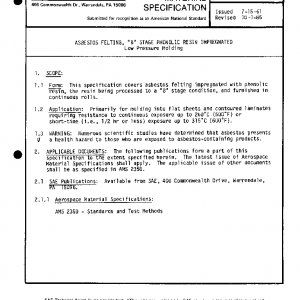 This specification covers asbestos felting impregnated with phenolic resin, the resin being processed to a “B” stage condition, and furnished in continuous rolls.