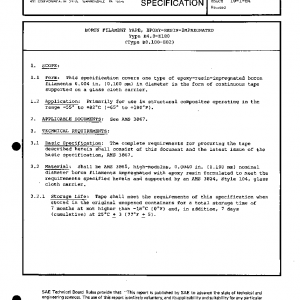 This specification covers one type of epoxy-resin-impregnated boron filaments 0.004 in. (0.100 mm) in diameter in the form of continuous tape supported on a glass cloth carrier.