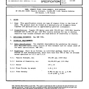 This specification covers one type of organic fiber in the form of yarn. The product shall be formed as a multiplicity of filaments drawn together and gathered into an approximately parallel arrangement.