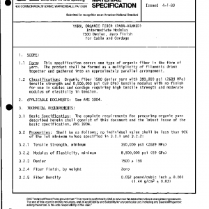 This specification covers one type of organic fiber in the form of yarn. The product shall be formed as a multiplicity of filaments drawn together and gathered into an approximately parallel arrangement.