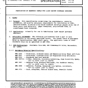 This specification establishes the requirements, controls, procedures, and quality assurance requirements for fabrication of flat, adhesive-bonded, aluminum-alloy-faced sandwich structure panels using one of three basic core materials: paper honeycomb, polyurethane foam, or aramid-paper-base honeycomb.