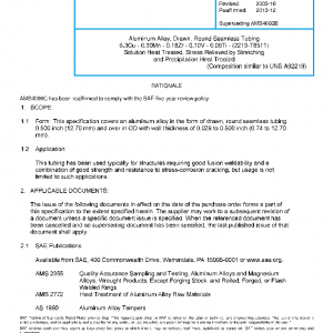This specification covers an aluminum alloy in the form of drawn, round seamless tubing 0.500 inch (12.70 mm) and over in OD with wall thickness of 0.029 to 0.500 inch (0.74 to 12.70 mm).