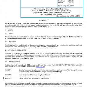 This specification covers an aluminum alloy in the form of drawn, round seamless tubing 0.500 inch (12.70 mm) and over in OD with nominal wall thickness of 0.029 to 0.500 inch (0.74 to 12.70 mm) (see 8.6).