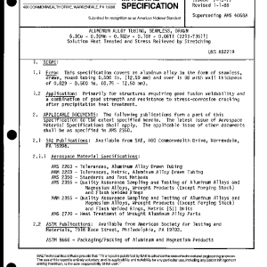 This specification covers an aluminum alloy in the form of seamless, drawn, round tubing 0.500 in. (12.50 mm) and over in OD with wall thickness of 0.029 – 0.500 in. (0.75 – 12.50 mm).