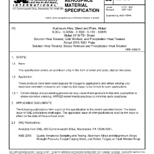 Aluminum Alloy, Sheet and Plate, Alclad 6.3Cu – 0.30Mn – 0.18Zr – 0.10V – 0.06Ti Alclad 2219-T81 Sheet Solution Heat Treated, Cold Worked, and Precipitation Heat Treated Alclad 2219-T851 Plate Solution Heat Treated, Stress Relieved and Precipitation Heat Treated