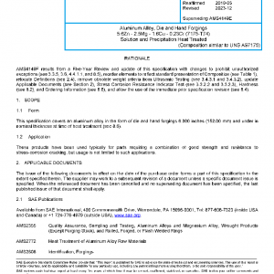 This specification covers an aluminum alloy in the form of die and hand forgings 6.000 inches (152.00 mm) and under in nominal thickness at time of heat treatment (see 8.6).