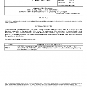 Aluminum Alloy, Extrusions 5.6Zn – 2.5Mg – 1.6Cu – 0.23Cr (7075-T73511) Solution Heat Treated, Stress Relieved by Stretching, and Overaged(Cancelled Jan 2012)