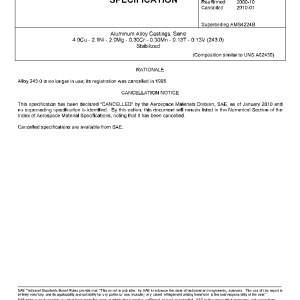 This specification has been declared “CANCELLED” by the Aerospace Materials Division, SAE, as of January 2010 and no superseding specification is identified. By this taction, this document will remain listed in the Numercial Section of the Index of Aerospace Material Specifications, noting that it has been cancelled.This specification covers an aluminum alloy in the form of sand castings. Primarily for components operating up to 600 °F (315 °C).