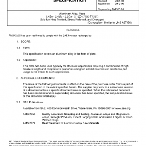 Aluminum Alloy, Plate 6.4Zn – 2.4Mg – 2.2Cu – 0.12Zr (7150-T7751) Solution Heat Treated, Stress Relieved, and Overaged