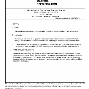 Aluminum Alloy, Extruded Bar, Rod, and Shapes 5.6Zn – 2.5Mg – 1.6Cu – 0.23Cr 7075-T76(51X) Solution Heat Treated and Overaged