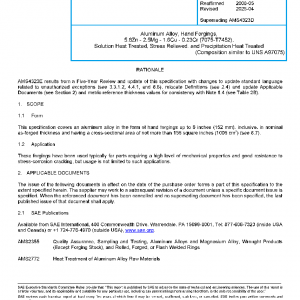 This specification covers an aluminum alloy in the form of hand forgings up to 6 inches (152 mm), inclusive, in nominal as-forged thickness and having a cross-sectional area of not more than 156 square inches (1006 cm2) (see 8.7).