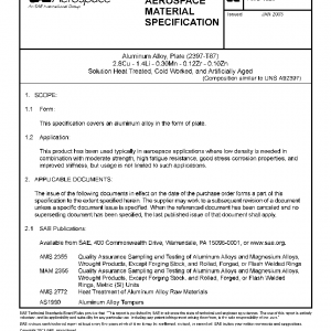 Aluminum Alloy, Plate (2397-T87) 2.8Cu – 1.4Li – 0.30Mn – 0.12Zr – 0.10Zn Solution Heat Treated, Cold Worked, and Artificially Aged