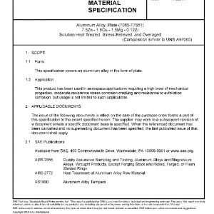 Aluminum Alloy, Plate (7085-T7651) 7.5Zn – 1.6Cu – 1.5Mg – 0.12Zr Solution Heat Treated, Stress-Relieved, and Overaged