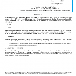 This specification covers an aluminum alloy in the form of extruded rods, bars, and profiles (shapes) 0.040 to 4.500 inches (1.02 to 114.30 mm), inclusive, in thickness produced with maximum cross sectional area of 56.1 square inches (36193 mm2) and a maximum circumscribing circle diameter (circle size) of 20.2 inches (513 mm) (see 2.4.1).
