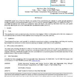 This specification covers an aluminum alloy in the form of die forgings 1.000 to 12.000 inches (25 to 305 mm), inclusive, in nominal thickness at the time of heat treatment and of forging stock of any size. (see 8.5)