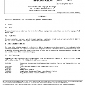 This specification covers a titanium alloy in the form of bars, forgings, flash welded rings, and stock for forging or flash welded rings.