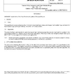 This specification covers a titanium alloy in the form of extruded bars, tubes, and shapes, flash welded rings, and stock for flash welded rings up through 4.000 sq. inch (25.81 cm2) cross-section.