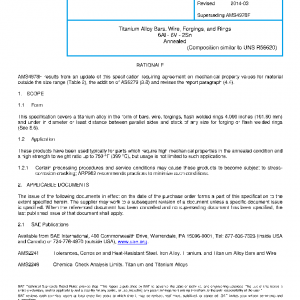 This specification covers a titanium alloy in the form of bars, wire, forgings, flash welded rings 4.000 inches (101.60 mm) and under in diameter or least distance between parallel sides and stock of any size for forging or flash welded rings (See 8.6).