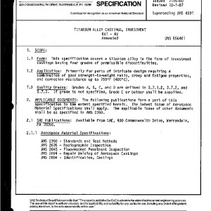 This specification covers a titanium alloy in the form of investment castings having four grades of permissible discontinuities.