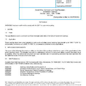 This specification covers a corrosion and heat-resistant cobalt alloy in the form of investment castings.