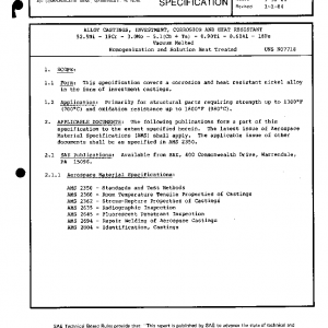 This specification covers a corrosion and heat resistant nickel alloy in the form of investment castings.