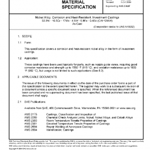 This specification covers a corrosion and heat-resistant nickel alloy in the form of investment castings.