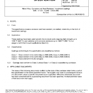 This specification covers a corrosion and heat-resistant, air-melted, nickel alloy in the form of investment castings.