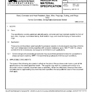 This specification covers a premium aircraft-quality, corrosion and heat resistant steel in the form of bars, wire, forgings, mechanical tubing, flash welded rings, and stock for forging or flash welded rings.