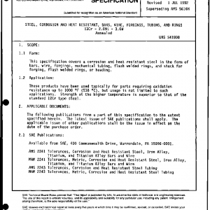 This specification covers a corrosion and heat resistant steel in the form of bars, wire, forgings, mechanical tubing, flash welded rings, and stock for forging, flash welded rings, or heading.