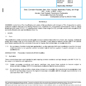 This specification covers a premium aircraft-quality corrosion-resistant steel in the form of bars, wire, forgings, mechanical tubing, flash welded rings up to 8.0 inches (203 mm) in diameter or least distance between parallel sides in the solution heat treated condition (see 8.4), and stock of any size for forging, flash welded rings, or heading (see 8.8).