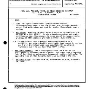 This specification covers a precipitation-hardenable, corrosion-resistant steel in the form of bars, wire, forgings, mechanical tubing, flash welded rings, and stock for forging, flash welded rings, or heading.