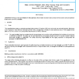 This specification covers a corrosion-resistant steel product 12 inches (305 mm) and under in nominal diameter, thickness or for hexagons, least distance between parallel sides, and having a maximum cross-sectional area of 144 square inches (930 cm2) in the solution and precipitation heat treated (H1075) condition.